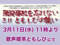 今年は東日本大震災、そして福島原発事故から15年目の年です。 原発事故によって15年経った現在も、ふるさとへ帰ることが出来ない人がたくさんいることに想いを寄せて、この原発事故を風化させないための取り組み「被災地にとどけ、歌の力支援企画」を継続して企画しています。 今回はちょうど15年目の3月11日に、そんな企画を開催します。ぜひ参加ください。 「原発事故を忘れない 3.11ともしびの集い」 原発事故を忘れない3.11ともしびの集い 日時 2026年3月11日(水) 開場 10:30 開演 11: ...