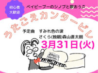 ベイビーブーのシノブさんが主宰するうたごえサークル「うたごえカンタービレ」の第8回目となるレッスンを、2026年3月31日(火)に開催します! シノブ先生の優しくとてもわかりやすい指導で、楽しくコーラスをしてみませんか! 初心者の方も大歓迎です。 毎回レッスンの最後には、ご参加の皆さんによる素敵なコーラスが完成して、店内に響きます♪♪ レッスンの時の様子です♪ チラシpdf うたごえカンタービレ 2026年3月31日(火) 13:30受付開始 13:50レッスンスタート 16:10終了 歌声喫茶ともしび ...