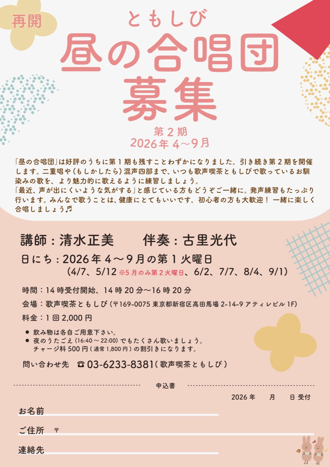 高田馬場に移転して3年目、いよいよ「昼の合唱団」を再開いたします!