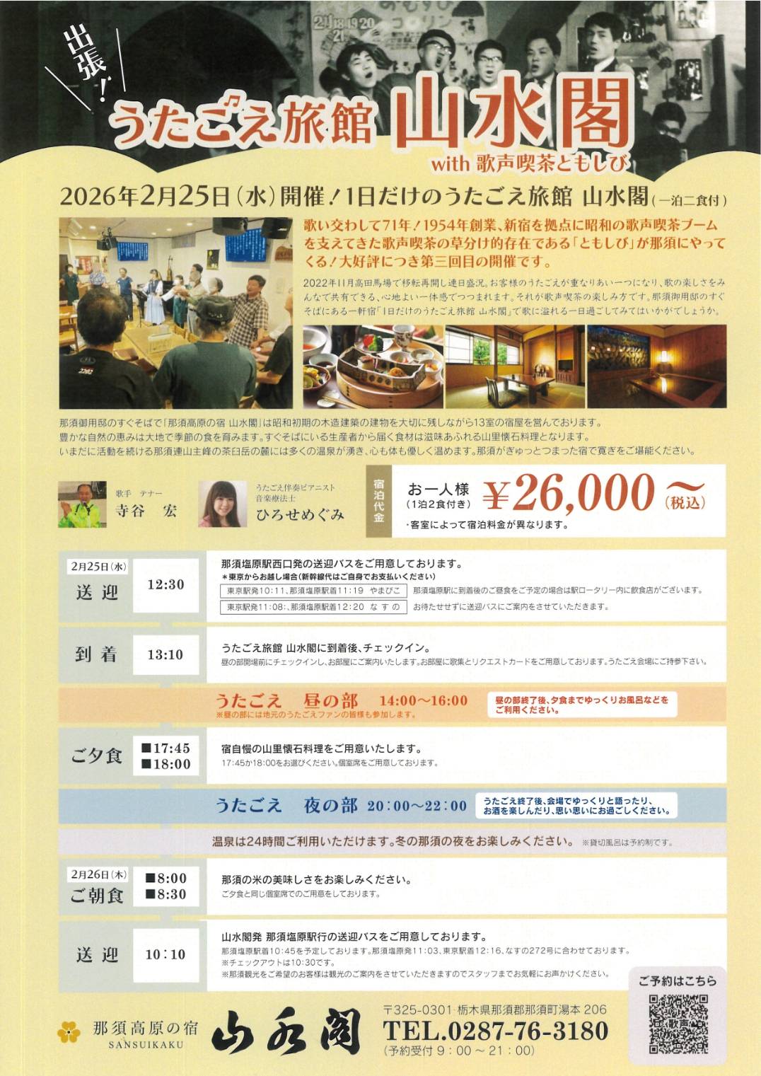 1400年の伝統を持つ那須塩原温泉の老舗旅館『山水閣』を、全館貸切で!昼から夜まで、うたと温泉三昧のうたごえファンのための新春企画です。