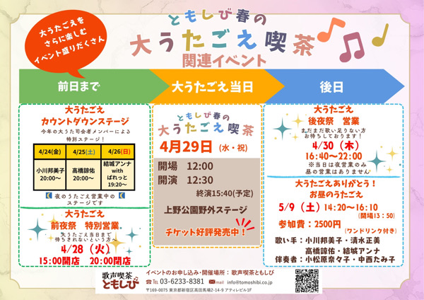 4月29日の「ともしび春の大歌声喫茶」の詳細については、こちらをご覧ください。