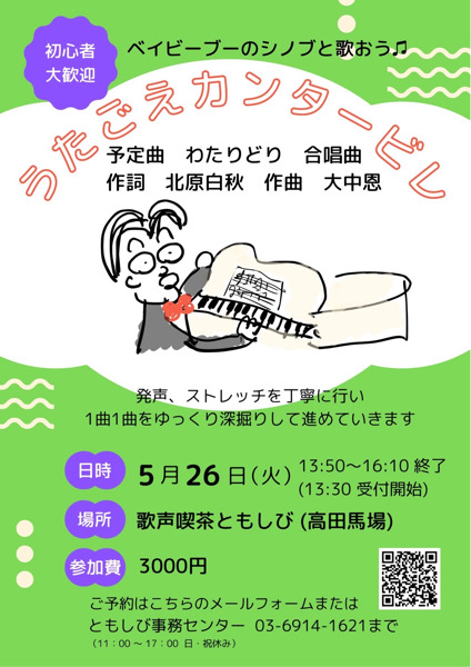 ベイビーブーのシノブさんが主宰するうたごえサークル「うたごえカンタービレ」の第9回目となるレッスンを、2026年5月26日(火)に開催します!