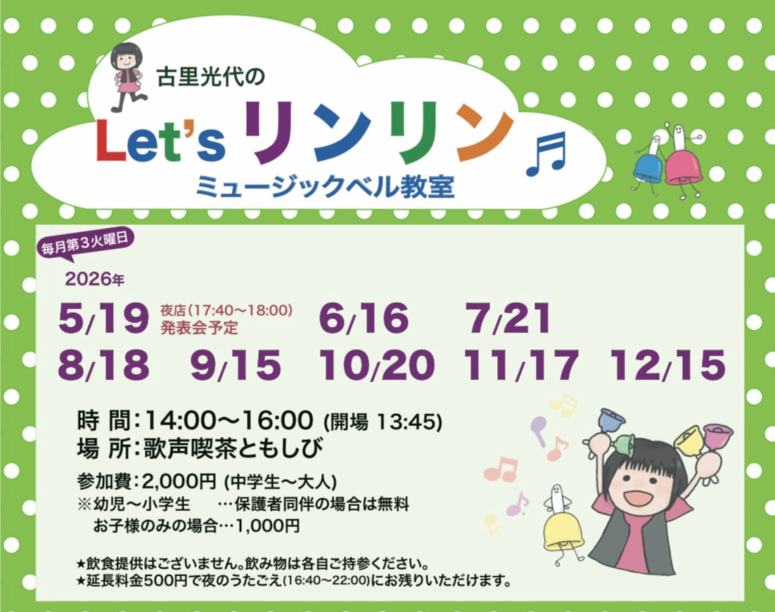 古里光代のミュージックベル教室 「Let's リンリン」は、月に1回歌声喫茶ともしびで開催しています。 ミュージックベルという楽器は、はじめましての人でも「さん、はい!」と気持ちを合わせて一緒に音楽を ...
